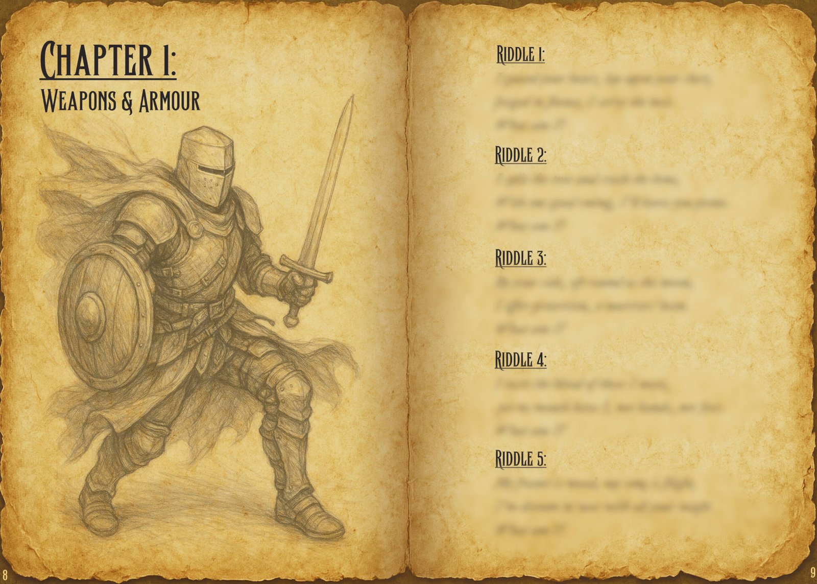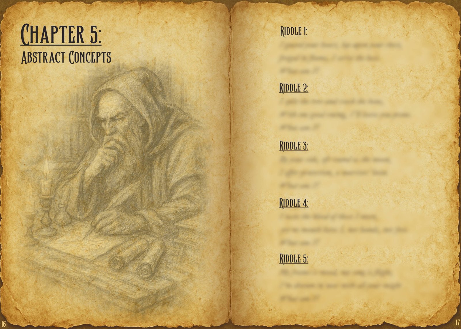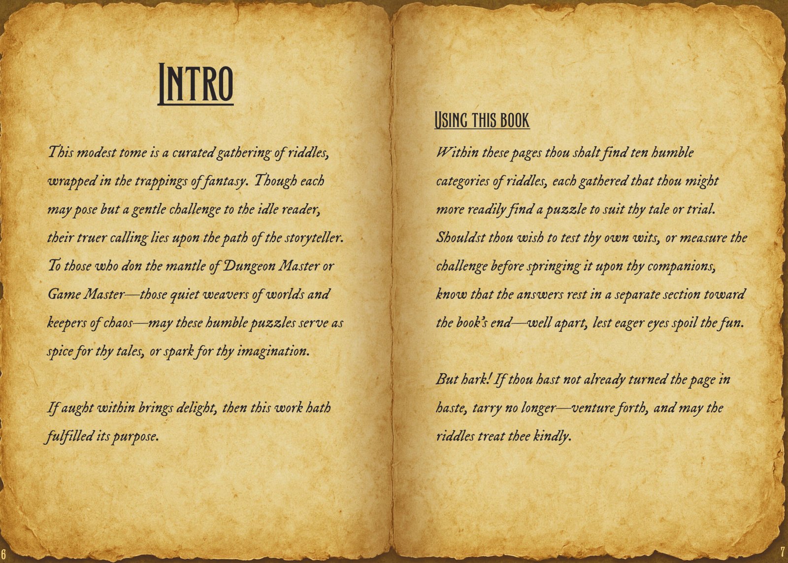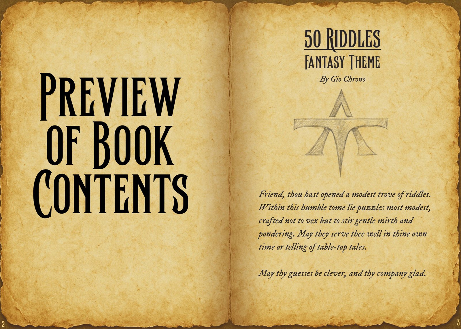 This digital book contains 50 fantasy-themed riddles, crafted to offer a mild challenge without stalling gameplay. Ideal for Dungeon Masters, Game Masters, and storytellers, these riddles are designed to spark curiosity, reward attention to detail, and enrich your campaign without encouraging metagaming.